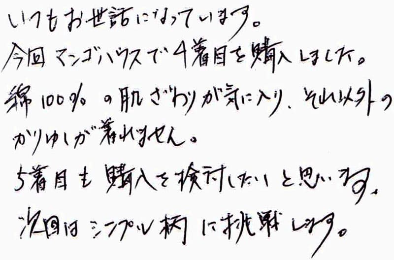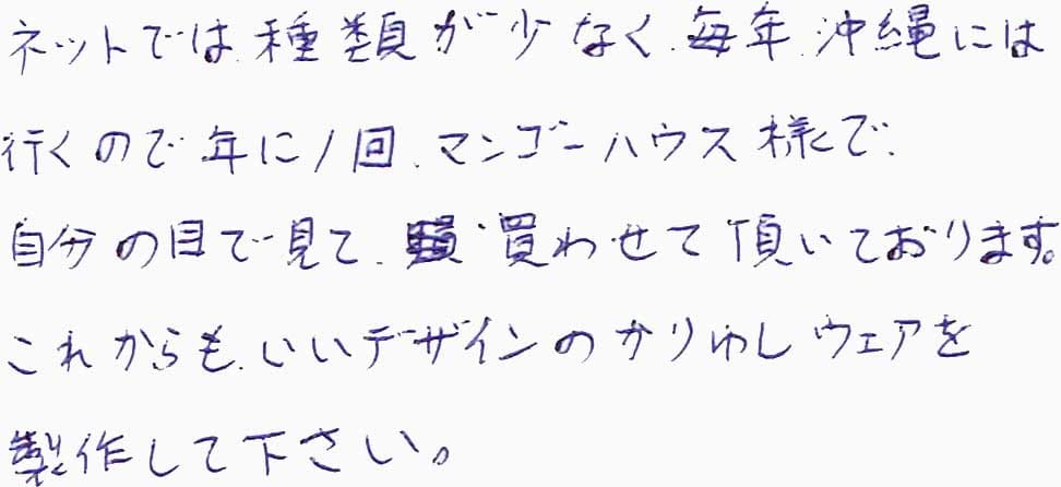 ネットでは種類が少なく、毎年、沖縄には行くので年に1回、マンゴーハウス様で、自分の目で見て、買わせて頂いております。これからも、いいデザインのかりゆしウェアを制作して下さい。