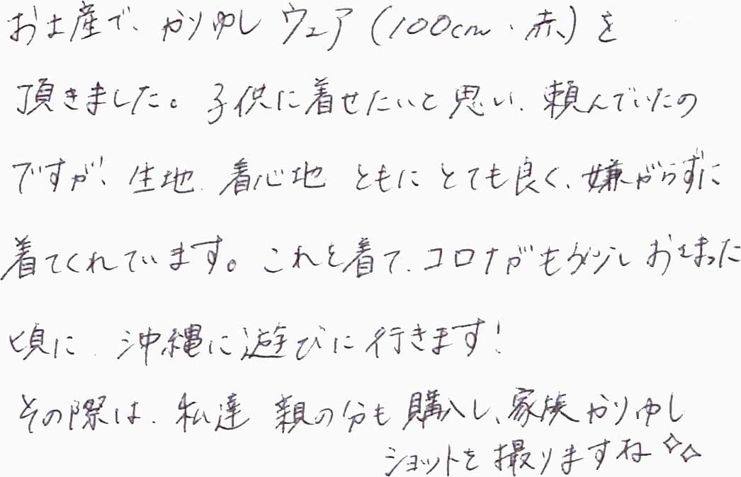 お土産で、かりゆしウェア(100㎝・赤)を頂きました。子供に着せたいと思い、頼んでいたのですが、生地、着心地ともにとても良く、嫌がらずに着てくれています。これを着て、コロナがもう少しおさまった頃に沖縄に遊びに行きます!その際は、私達親の分も購入し、家族かりゆしショットを撮りますね。