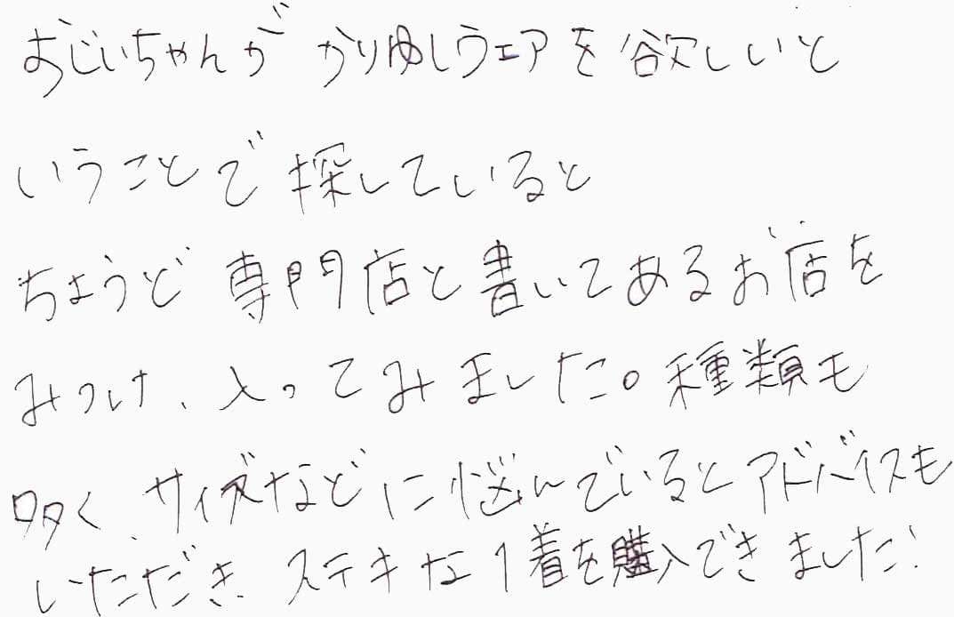 おじいちゃんがかりゆしウェアを欲しいということで探していると、ちょうど専門店と書いてあるお店をみつけ、入ってみました。種類も多く、サイズなどに悩んでいるとアドバイスもいただき、ステキな1着を購入できました。