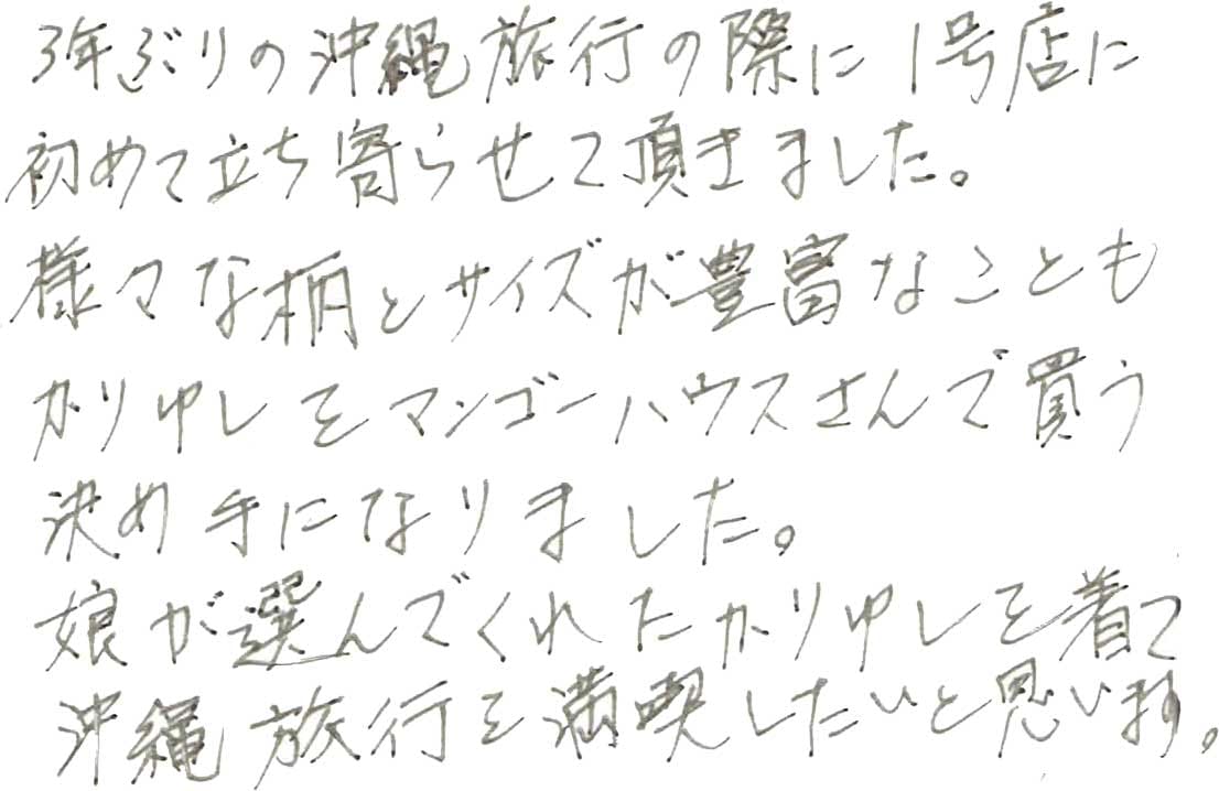3年ぶりの沖縄旅行の際に1号店に初めて立ち寄らせて頂きました。様々な柄とサイズが豊富なこともかりゆしをマンゴーハウスさんで買う決め手になりました。娘が選んでくれたかりゆしを着て沖縄旅行を満喫したいと思います。