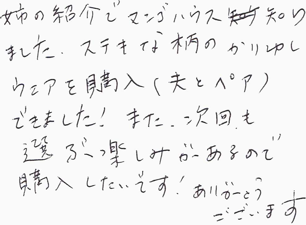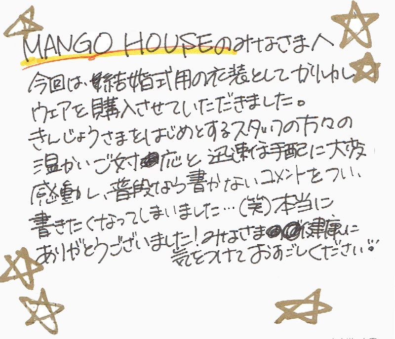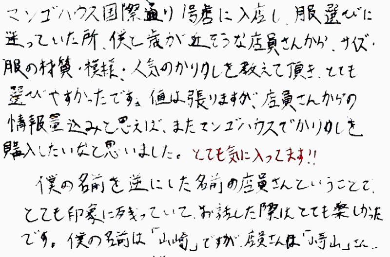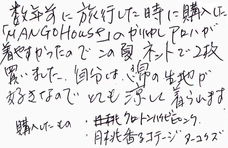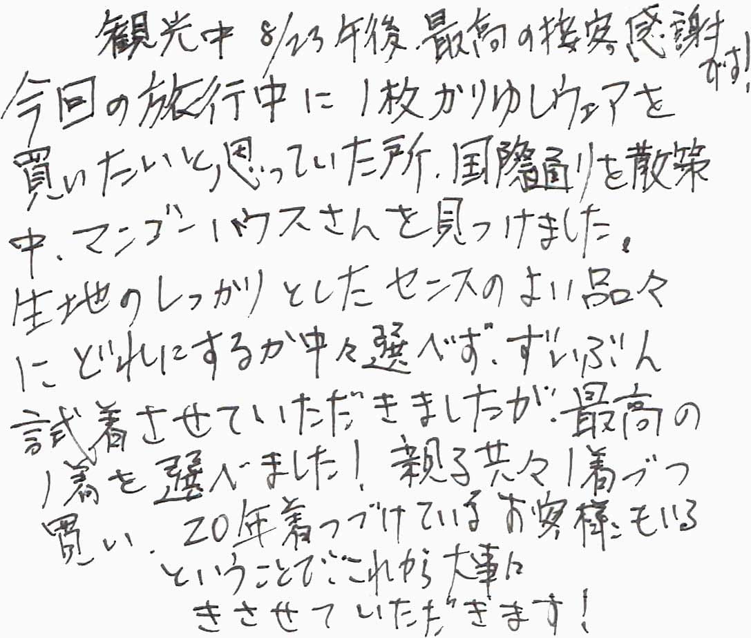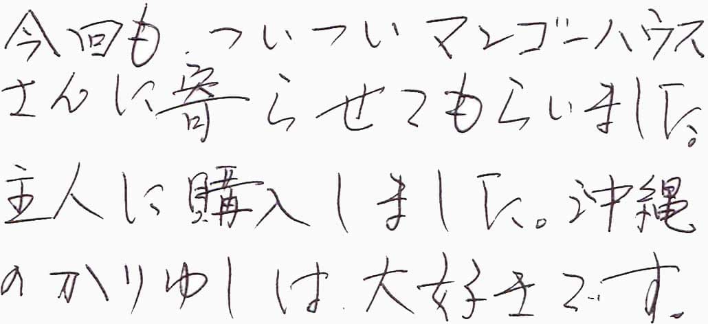 沖縄旅行に行った時、たまたま通りがかったお店がMANGO HOUSEでした。主人にかりゆし買ってきて!と言われてたので探していたらお店の人にとっても親切にアドバイスして頂きました。家に帰って見せるとすごく喜んでました。ありがとうございました。