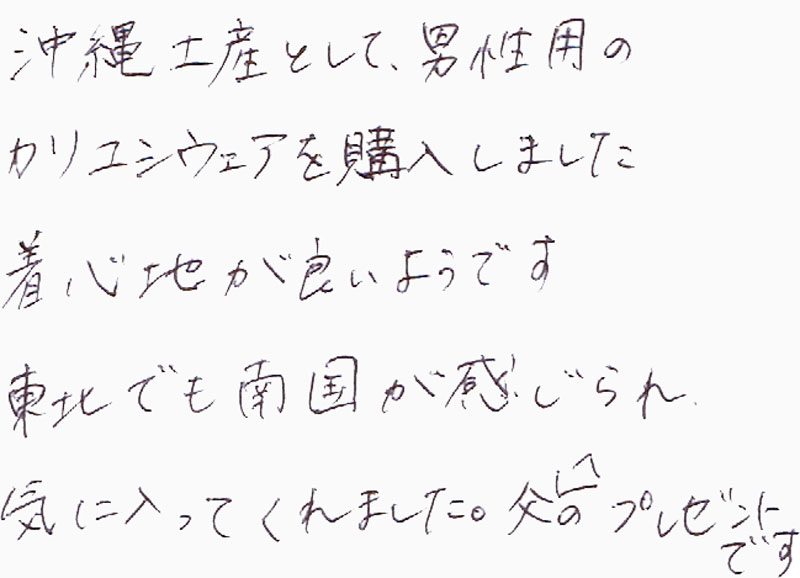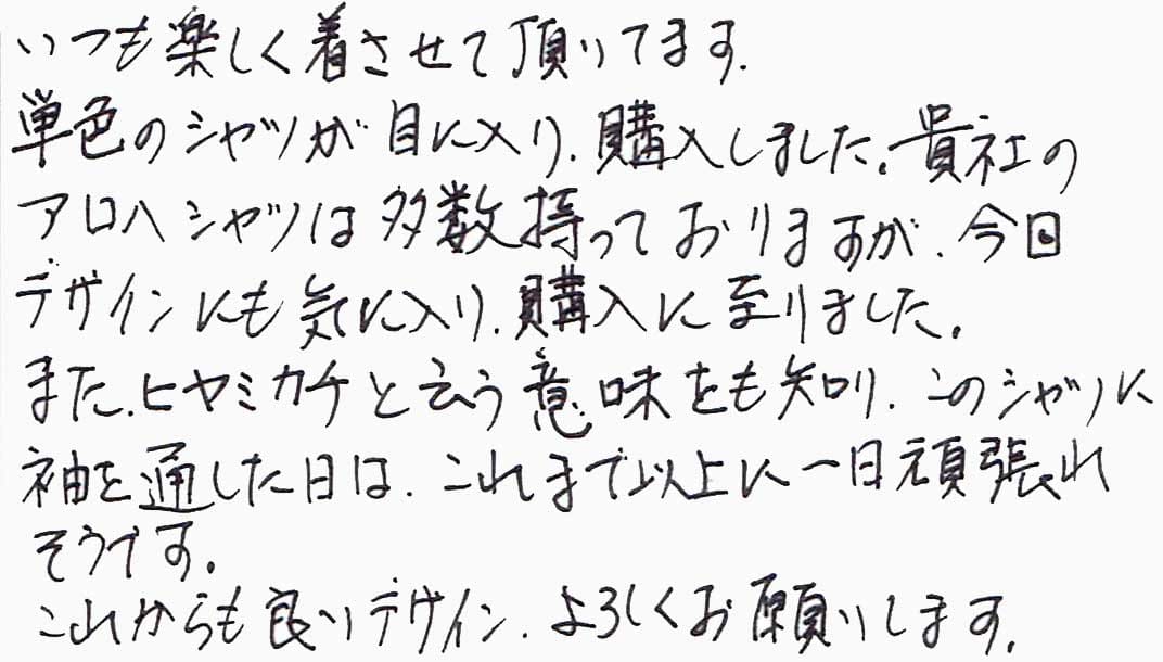 - これからも、いいデザインのかりゆしウェアを制作して下さい。