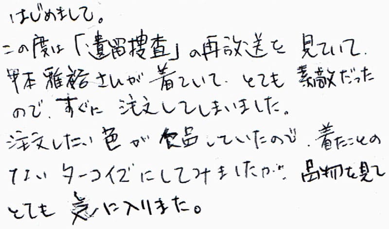 はじめまして。この度は「遺留捜査」の再放送を見ていて甲本雅裕さんが着ていて、とても素敵だったので、すぐに注文してしまいました。注文したい色が欠品していたので、着たことのないターコイズにしてみましたが、品物を見てとても気に入りました。