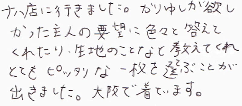 ナハ店に行きました。かりゆしが欲しかった主人の要望に色々と答えてくれたり、生地のことなど教えてくれ、とてもピッタリな一枚を選ぶことが出きました。大阪で着ています。