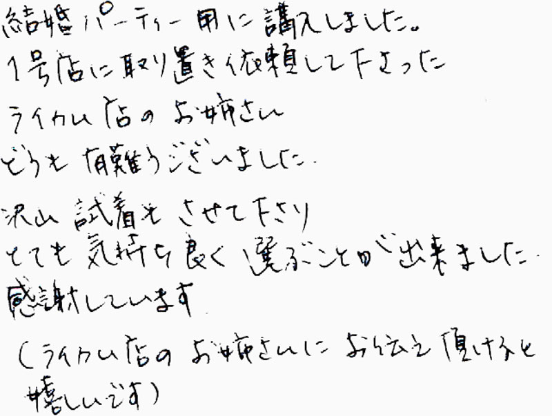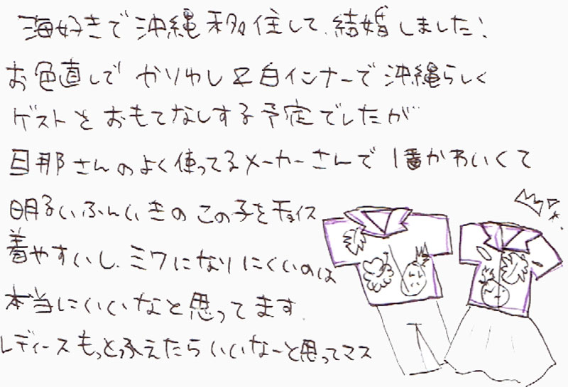- 結婚式用の衣装としてかりゆしウェアを購入させていただきました。