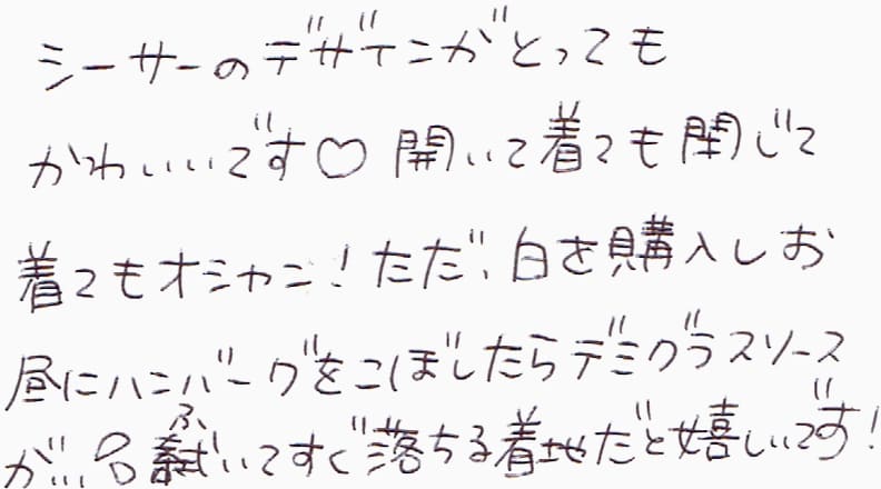 シーサーのデザインがとってもかわいいです。開いて着ても閉じて着てもオシャン!ただ、白を購入しお昼にハンバーグをこぼしたらデミグラスソースが…。ふいてすぐ落ちる着地だと嬉しいです!