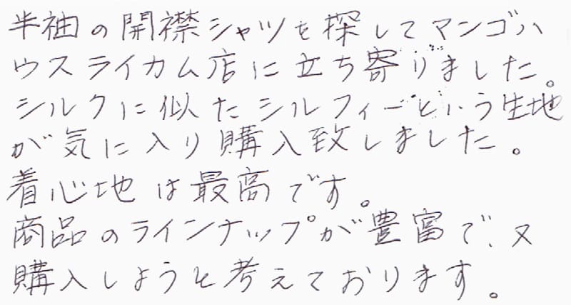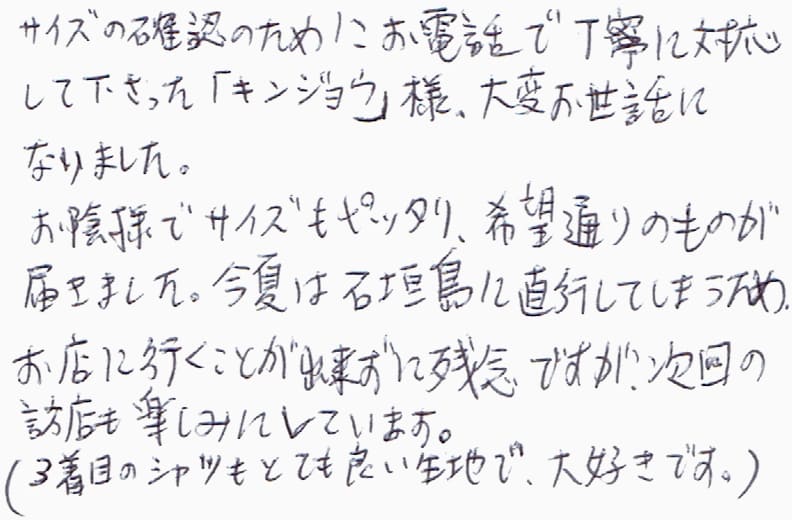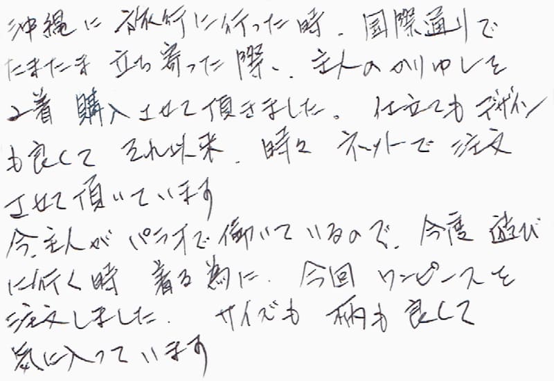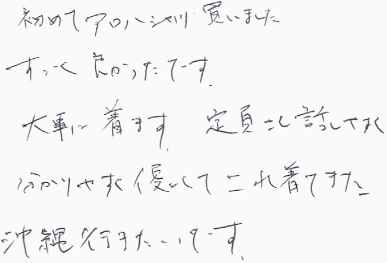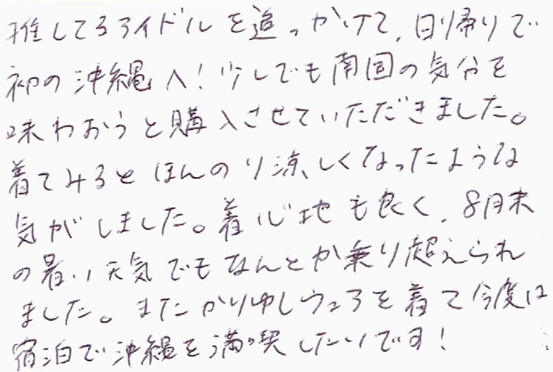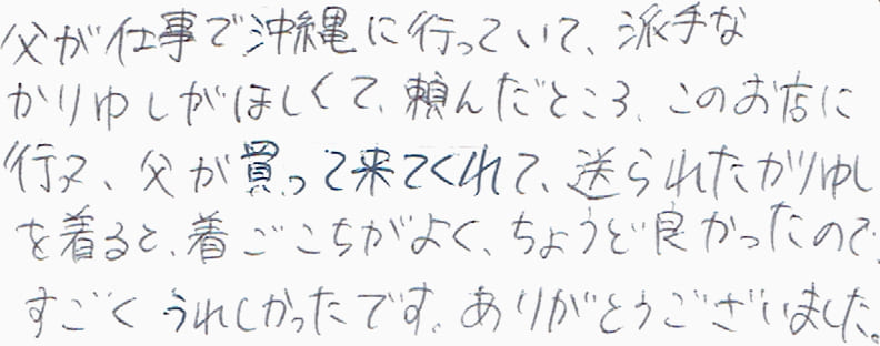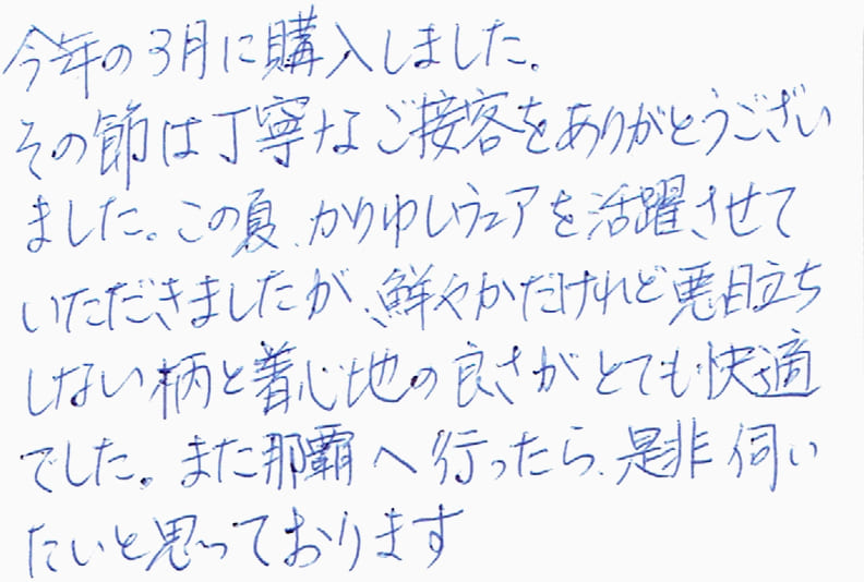 今年の3月に購入しました。その節は丁寧なご接客をありがとうございました。この夏、かりゆしウェアを活躍させていただきましたが、鮮やかだけれど悪目立ちしない柄と着心地の良さがとても快適でした。また那覇へ行ったら、是非伺いたいと思っております。