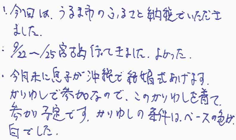 ・今回は、うるま市のふるさと納税でいただきました。・9/22~/25宮古島行ってきました。よかった。・今月末に息子が沖縄で結婚式をあげます。かりゆしで参加なので、このかりゆしを着て、参加予定です。かりゆしの条件は、ベースの色が、白でした。