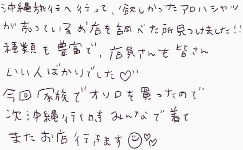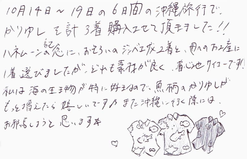 10月14日~19日の6日間の沖縄旅行で、かりゆしを計3着購入させて頂きました!!ハネムーンの記念におそろいのジンベエザメ2着と、母へのお土産に1着選びましたが、どれも素材が良く、着心地サイコーです!私は海の生物が特に好きなので、魚柄のかりゆしがもっと増えたら嬉しいです♪また沖縄に行く際には、お邪魔しようと思います☆