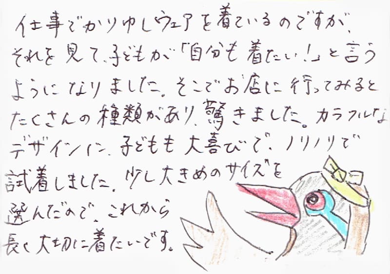 仕事でかりゆしウェアを着ているのですが、それを見て、子どもが「自分も着たい!」と言うようになりました。そこでお店に行ってみるとたくさんの種類があり、驚きました。カラフルなデザインに、子どもも大喜びで、ノリノリで試着しました。少し大きめのサイズを選んだので、これから長く大切に着たいです。