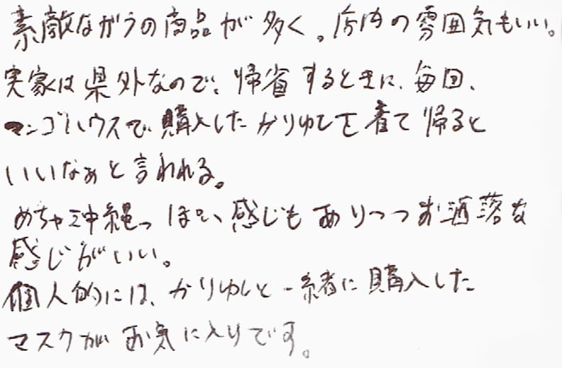 素敵なガラの商品が多く、店内の雰囲気もいい。実家は県外なので、帰省するときに、毎回、マンゴハウスで購入したかりゆしを着て帰るといいなぁと言われる。めちゃ沖縄っぽい感じもありつつお洒落な感じがいい。個人的には。かりゆしと一緒に購入したマスクがお気に入りです。