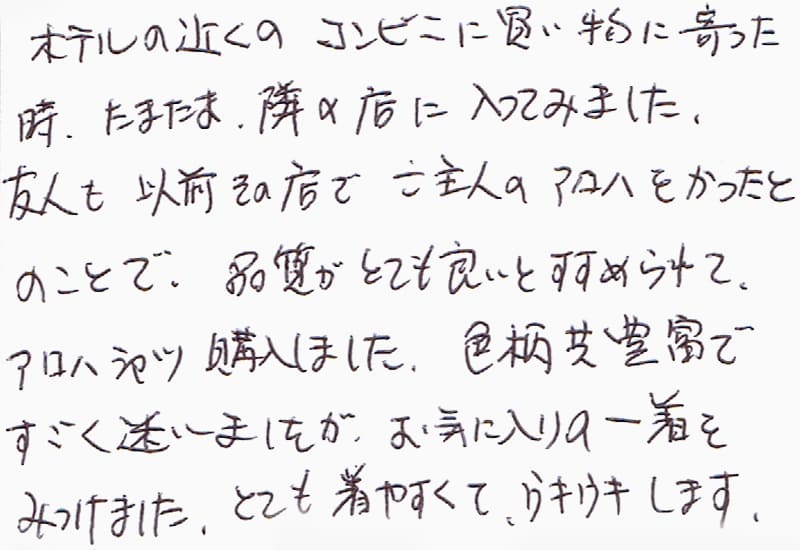 ホテルの近くのコンビニに買い物に寄った時、たまたま、隣の店に入ってみました。友人も以前そのお店でご主人のアロハをかったとのことで、品質がとても良いとすすめられて、アロハシャツ購入しました。色柄共豊富ですごく迷いましたが、お気に入りの一着をみつけました。とても着やすくて、ウキウキします。
