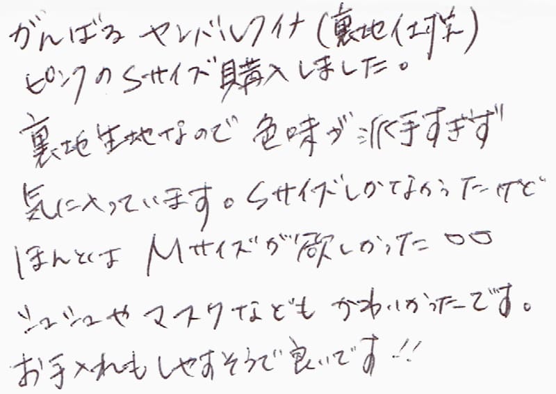がんばるヤンバルクイナ(裏地仕様)ピンクのSサイズ購入しました。裏地生地なので色味が派手すぎず気に入っています。Sサイズしかなかったけど、ほんとはMサイズが欲しかった。。シュシュやマスクなどもかわいかったです。お手入れもしやすそうで良いです!!