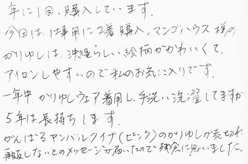 年に1回、購入しています。今回は、仕事用に2着購入。マンゴハウス様のかりゆしは、沖縄らしい絵柄がかわいくて、アイロンしやすいので私のお気に入りです。一年中、かりゆしウェア着用し、手洗い洗濯してますが、5年は長持ちします。がんばるヤンバルクイナ(ピンク)のかりゆしが売切れ、再販しないとのメッセージが届いたので残念に思いました。