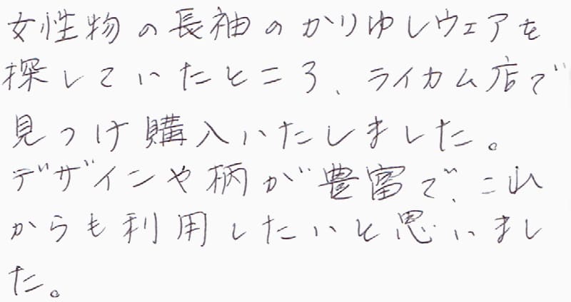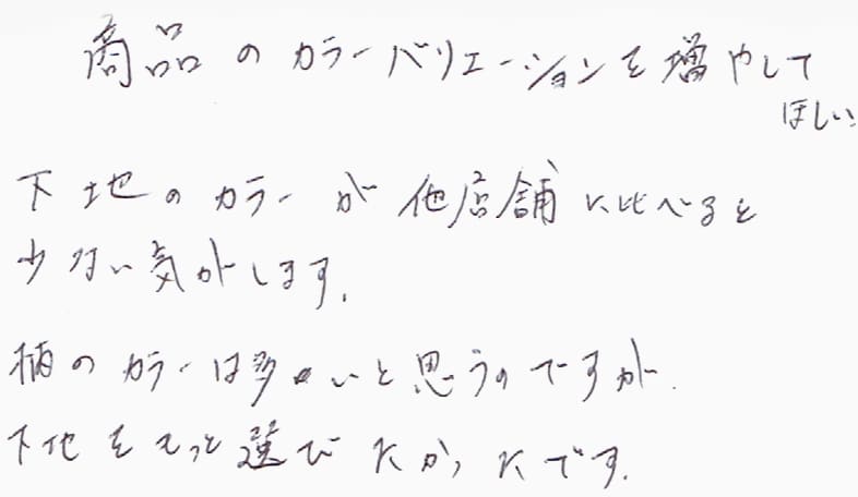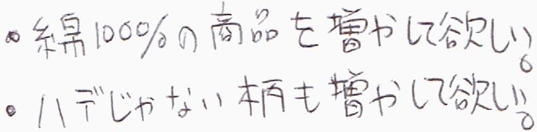 - 綿100%の商品を増やして欲しい。