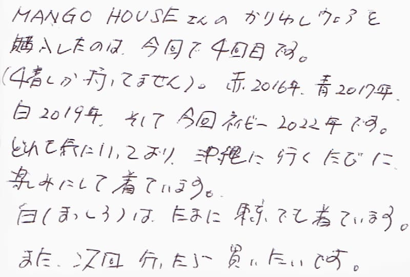 MANGO HOUSEさんのかりゆしウェアを購入したのは、今回で4回目です。(4着しか持ってません)。赤2016年、青2017年、白2019年、そして今回ネイビー2022年です。どれも気にいっており、沖縄に行くたびに、楽しみにして着ています。白(まっしろ)は、たまに東京でも着ています。また、次回行ったら買いたいです。