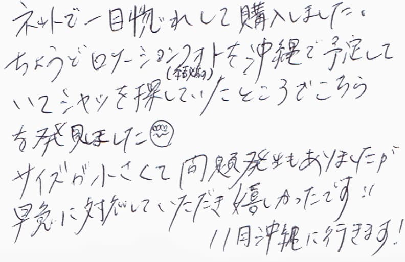 ネットで一目惚れして購入しました。ちょうどロケーションフォト(結婚の)を沖縄で予定していてシャツを探していたところでこちらを発見しました。サイズが小さくて問題発生もありましたが、早急に対応していただき嬉しかったです!!11月沖縄に行きます!