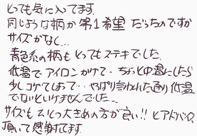 とっても気に入ってます。同じような柄か第1希望だったのですがサイズがなく…青色系の柄もとってもステキでした。低温でアイロンかけて、ちょっと中温にしたら少しコゲてしまって…やっぱり言われた通り低温でないといけませんでした。サイズもひとつ大きめの方が良い!!とアドバイス頂いて感謝しています。