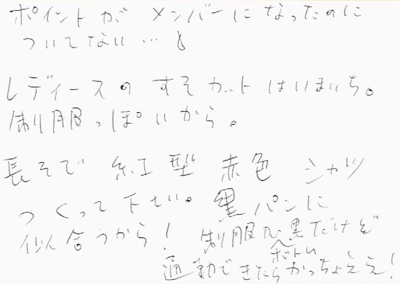 ポイントがメンバーになったのについてない…。レディースのすそカットはいまいち。制服っぽいから。長そで紅型赤色シャツつくって下さい。黒パンに似合うから!制服がボトム黒だけど通勤できたらかっちょええ!