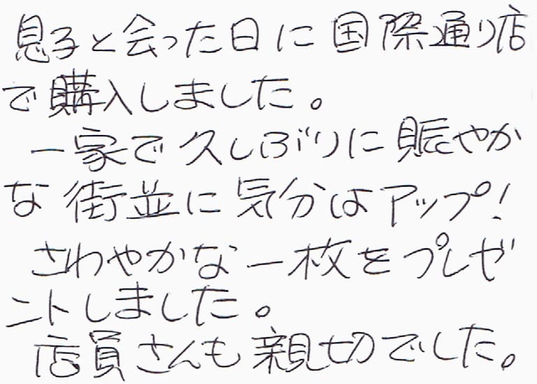 息子と会った日に国際通り店で購入しました。一家で久しぶりに賑やかな街並に気分はアップ!さわやかな一枚をプレゼントしました。店員さんも親切でした。