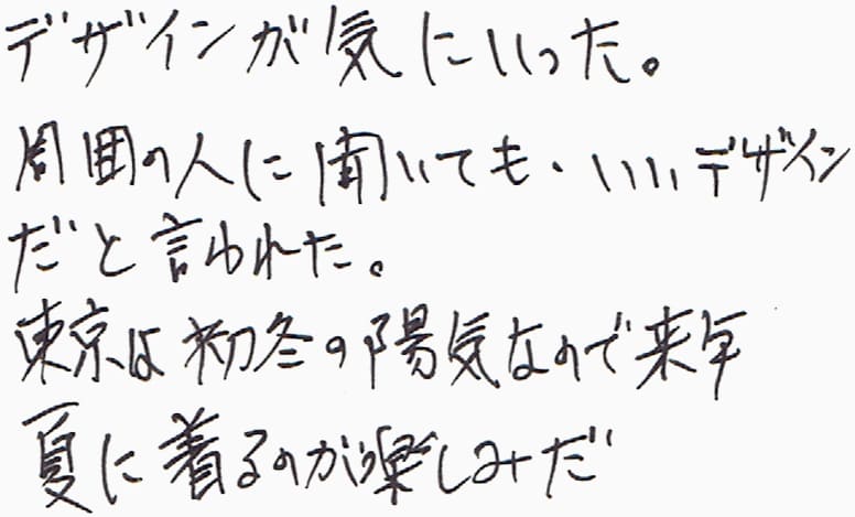 デザインが気にいった。周囲の人に聞いても、いいデザインだと言われた。東京は初冬の陽気なので来年、夏に着るのが楽しみだ。