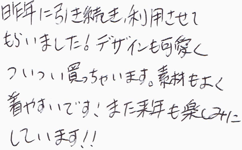 昨年に引き続き、利用させてもらいました!デザインも可愛くついつい買っちゃいます。素材もよく着やすいです!また来年も楽しみにしています!!