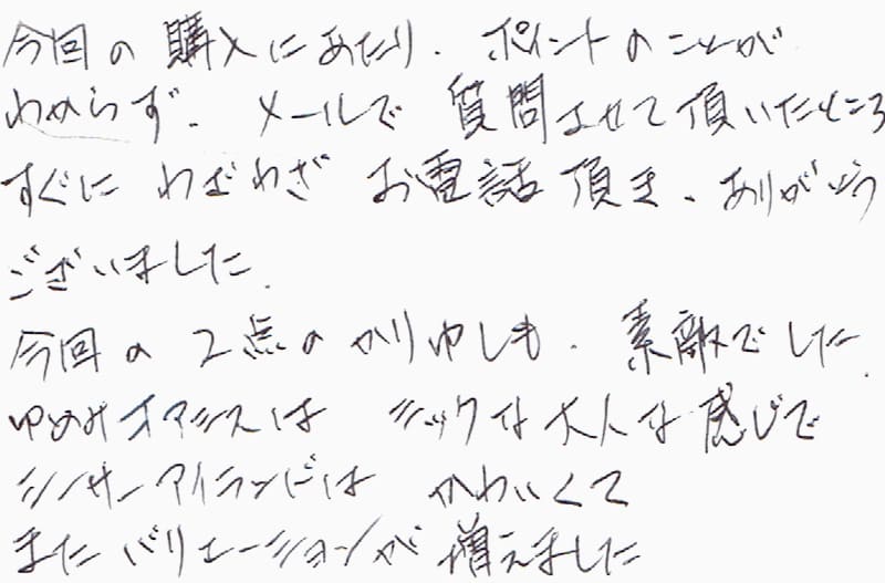 今回の購入にあたり、ポイントのことがわからず、メールで質問させて頂いたところすぐにわざわざお電話頂き、ありがとうございました。今回の2点のかりゆしも、素敵でした。ゆめみオアシスはシックな大人な感じでシーサーアイランドはかわいくてまたバリエーションが増えました。