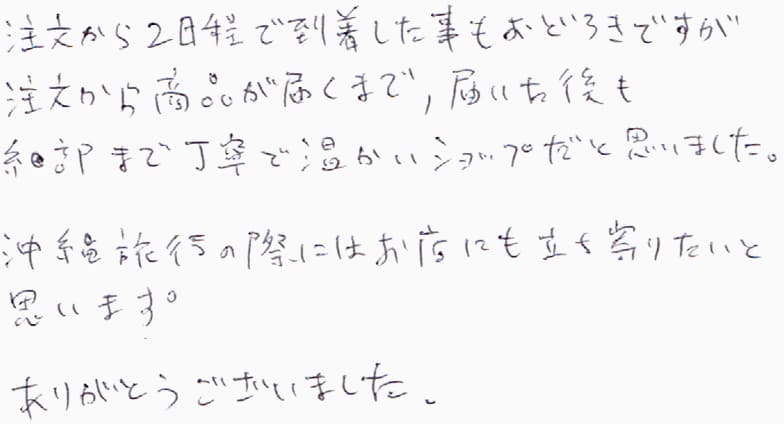 注文から2日程で到着した事もおどろきですが、注文から商品が届くまで、届いた後も細部まで丁寧で温かいショップだと思いました。沖縄旅行の際にはお店にも立ち寄りたいと思います。ありがとうございました。
