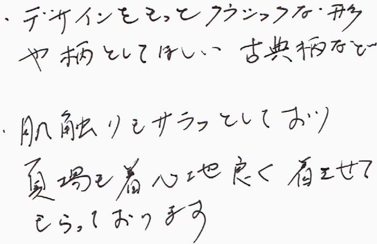 ・デザインをもっとクラシックな形や柄としてほしい古典柄など・肌触りもサラッとしており夏場も着心地良く着させてもらっております。