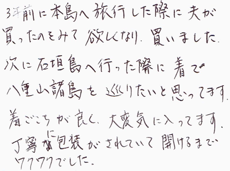 3年前に本島へ旅行した際に夫が買ったのをみて欲しくなり、買いました。次に石垣島へ行った際に着て八重山諸島を巡りたいと思っています。着ごこちが良く、大変気に入ってます。丁寧に包装ががされていて開けるまでワクワクでした。