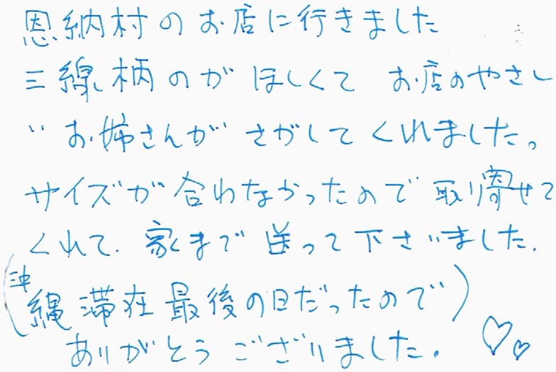 恩納村のお店に行きました。三線柄のがほしくてお店のやさしいお姉さんがさがしてくれました。サイズが合わなかったので取り寄せてくれて、家まで送って下さいました。(沖縄滞在差後の日だったので)ありがとうございました。