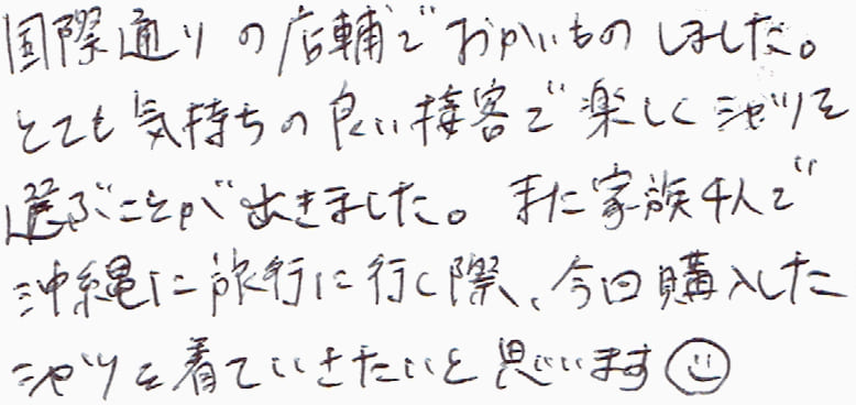 国際通りの店舗でおかいものしました。とても気持ちの良い接客で楽しくシャツを選ぶことが出きました。また家族4人で沖縄に旅行に行く際、今回購入したシャツを着ていきたいと思います。