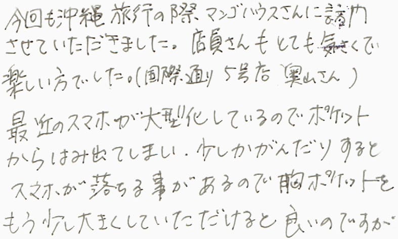 今回も沖縄旅行の際マンゴハウスさんに訪問させていただきました。店員さんもとても気さくで楽しい方でした。(国際通り5号店奥山さん)最近のスマホが大型化しているのでポケットからはみ出してしまい、少しかかんだりするとスマホが落ちる事があるので胸ポケットをもう少し大きくしていただけると良いのですが。