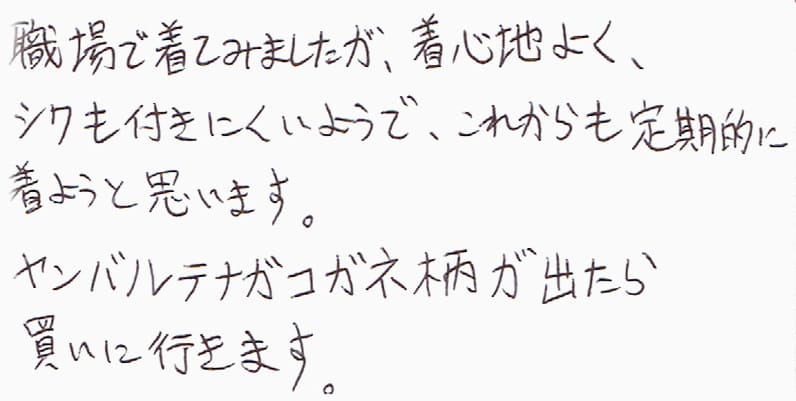- 職場で着てみましたが、着心地がよく、シワも付きにくいようで、これからも定期的に着ようと思います。