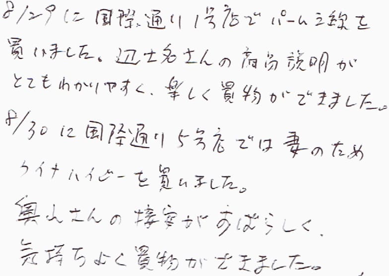 8/29に国際通り1号店でパーム三線を買いました。辺士名さんの商品説明がとてもわかりやすく、楽しく買物ができました。8/30に国際通り5号店では妻のためクイナハイビーを買いました。奥山さんの接客がすばらしく、気持ちよく買物ができました。