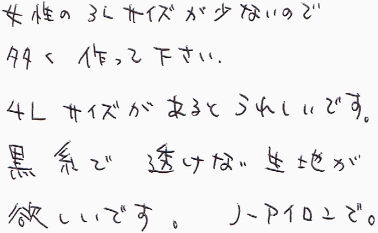 女性の3Lサイズが少ないので多く作ってください。4Lサイズがあるとうれしいです。黒糸で透けない生地が欲しいです。ノーアイロンで。