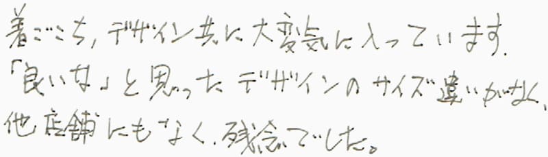 着ごこち、デザイン共に大変気に入っています。「良いな」と思ったデザインのサイズ違いがなく、他店舗にもなく、残念でした。