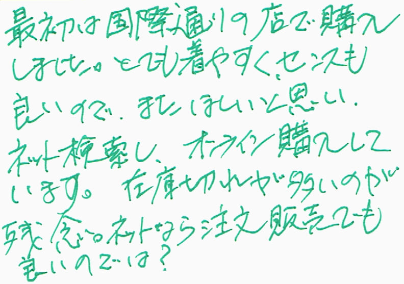 最初は国際通りの店で購入しました。とても着やすく、センスも良いので、またほしいと思い、ネット検索し、オンライン購入しています。在庫切れが多いが残念。ネットなら注文販売でも良いのでは?