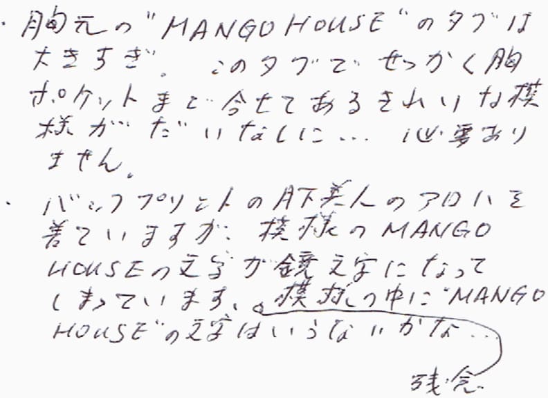 - ・胸元の“MANGO HOUSE”のタグは大きすぎ。