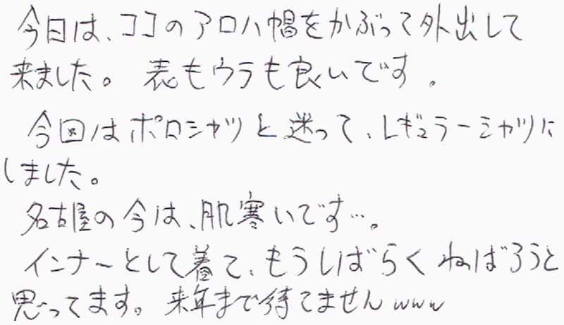 今日は、ココのアロハ帽をかぶって外出して来ました。表もウラも良いです。今回はポロシャツと迷って、レギュラーシャツにしました。名古屋の今は、肌寒いです…。インナーとして着て、もうしばらくねばろうと思っています。来年まで待てませんwww