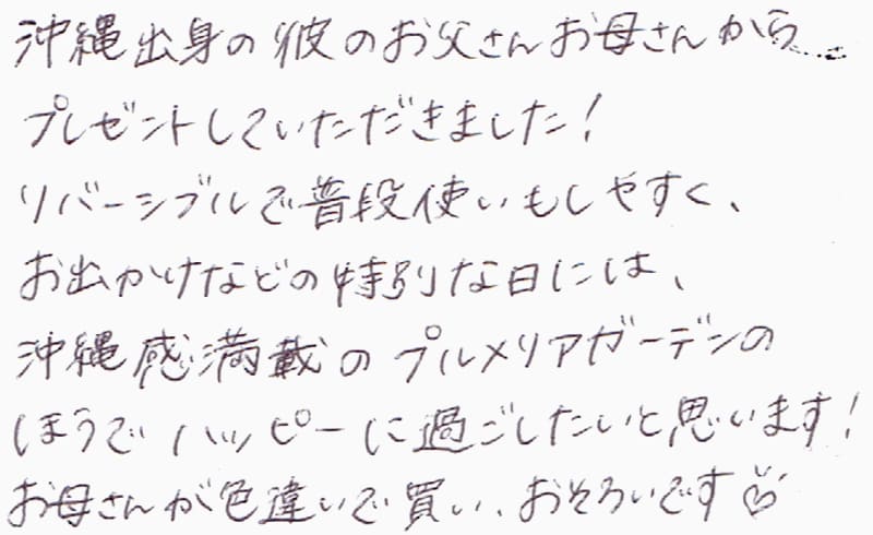 沖縄出身の彼のお父さんお母さんからプレゼントしていただきました!リバーシブルで普段使いもしやすく、お出かけなどの特別な日には、沖縄感満載のプルメリアガーデンのほうでハッピーに過ごしたいと思います!お母さんが色違いで買い、おそろいです。