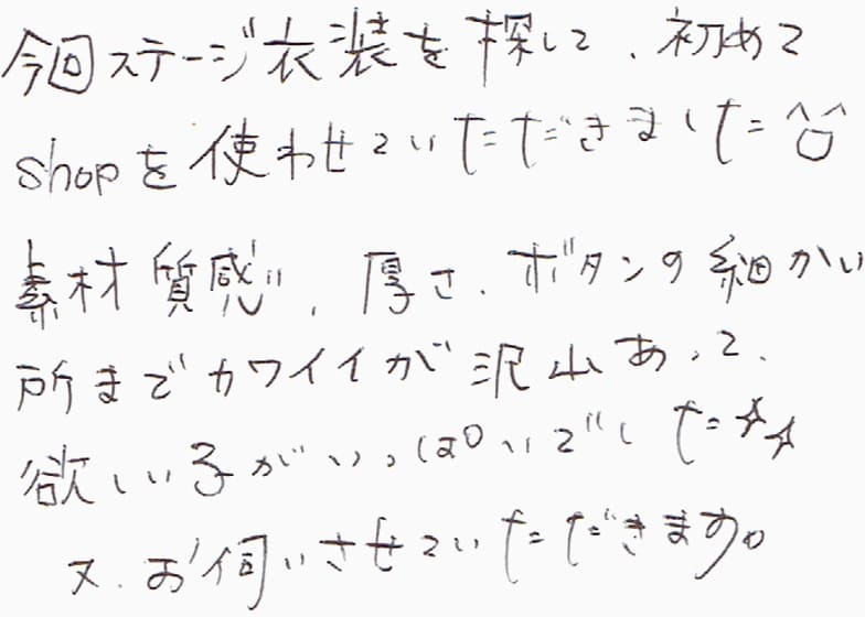 今回ステージ衣装を探して、初めてshopを使わせていただきました^ロ^