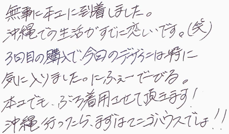 無事に本土に到着しました。沖縄での生活がすでに恋しいです。(笑)3回目の購入で、今回のデザインは特に気に入りました。にふぇーでーびる。本土でも、ぶち着用させて頂きます!沖縄行ったら、まずはマンゴハウスでしょ!!
