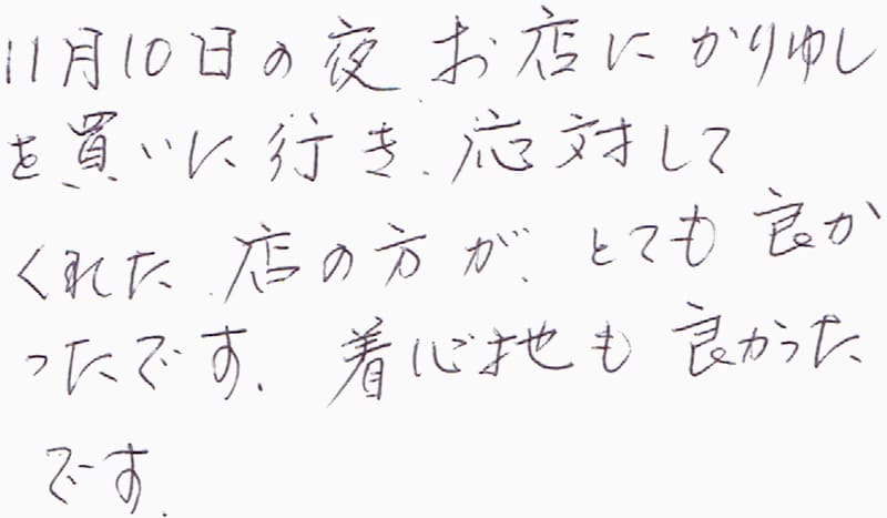 11月10日の夜、お店にかりゆしを買いに行き、応対してくれた、店の方が、とても良かったです。着心地も良かったです。