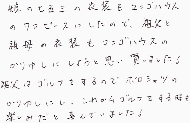 娘の七五三の衣装をマンゴハウスのワンピースにしたので、祖父と祖母の衣装もマンゴハウスのかりゆしにしようと思い買いました!祖父はゴルフをするのでポロシャツのかりゆしにし、これからゴルフをする時も楽しみだと喜んでいました!
