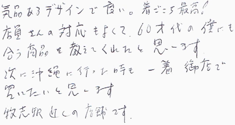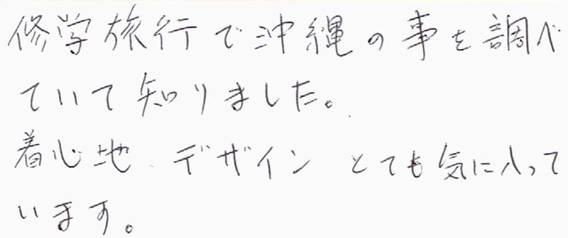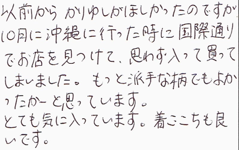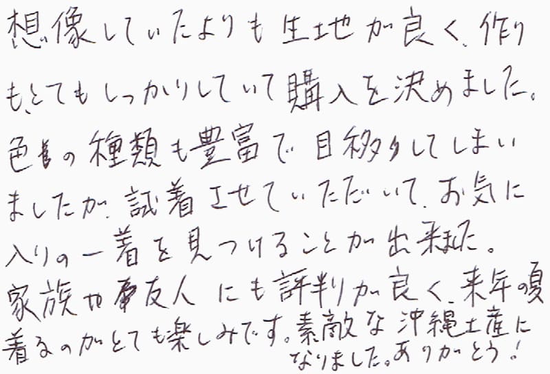 想像していたよりも生地が良く、作りも、とてもしっかりしていて購入を決めました。色の種類も豊富で目移りしてしまいましたが、試着させていただいて、お気に入りの一着を見つけることが出来ました。家族や友人にも評判が良く、来年の夏着るのがとても楽しみです。素適な沖縄土産になりました。ありがとう!