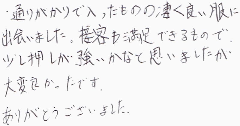・通りがかりで入ったものの凄く良い服に出会いました。接客も満足できるもので、少し押しが強いかなと思いましたが大変良かったです。ありがとうございました。