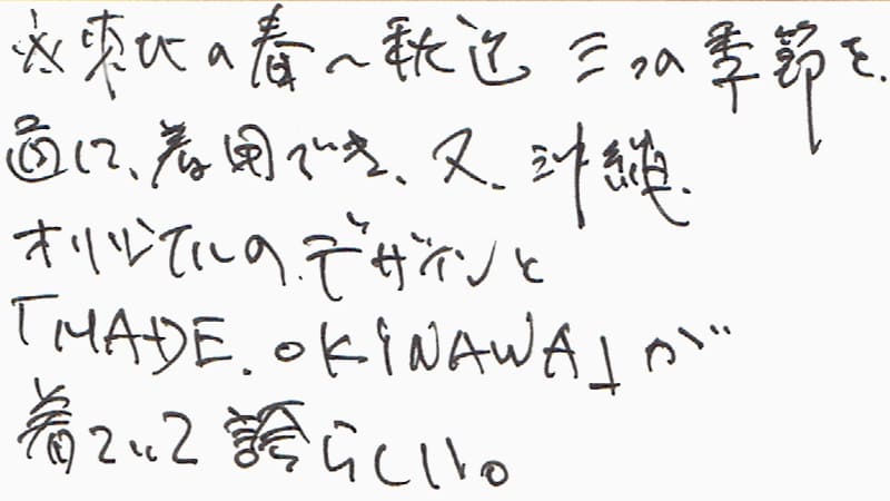 ※東北の春~秋迄三つの季節を、通して、着用でき、又、沖縄、オリジナルのデザインと「MADE.OKINAWA」が着ていて誇らしい。