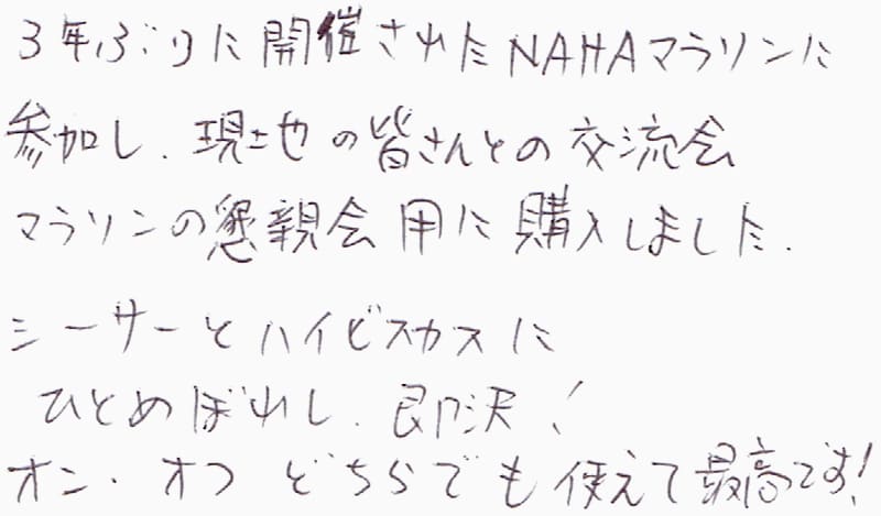 3年ぶりに開催されたNAHAマラソンに参加し、現地の皆さんとの交流会マラソンの懇親会用に購入しました。シーサーとハイビスカスにひとめぼれし、即決!オン・オフどちらでも使えて最高です!