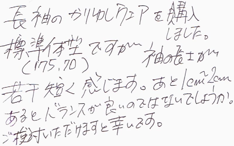 長袖のかりゆしウェアを購入しました。標準体型(175,70)ですが袖の長さが若干短く感じます。あと1㎝~2㎝あるとバランスが良いのではないでしょうか。ご検討いただけますと幸いです。